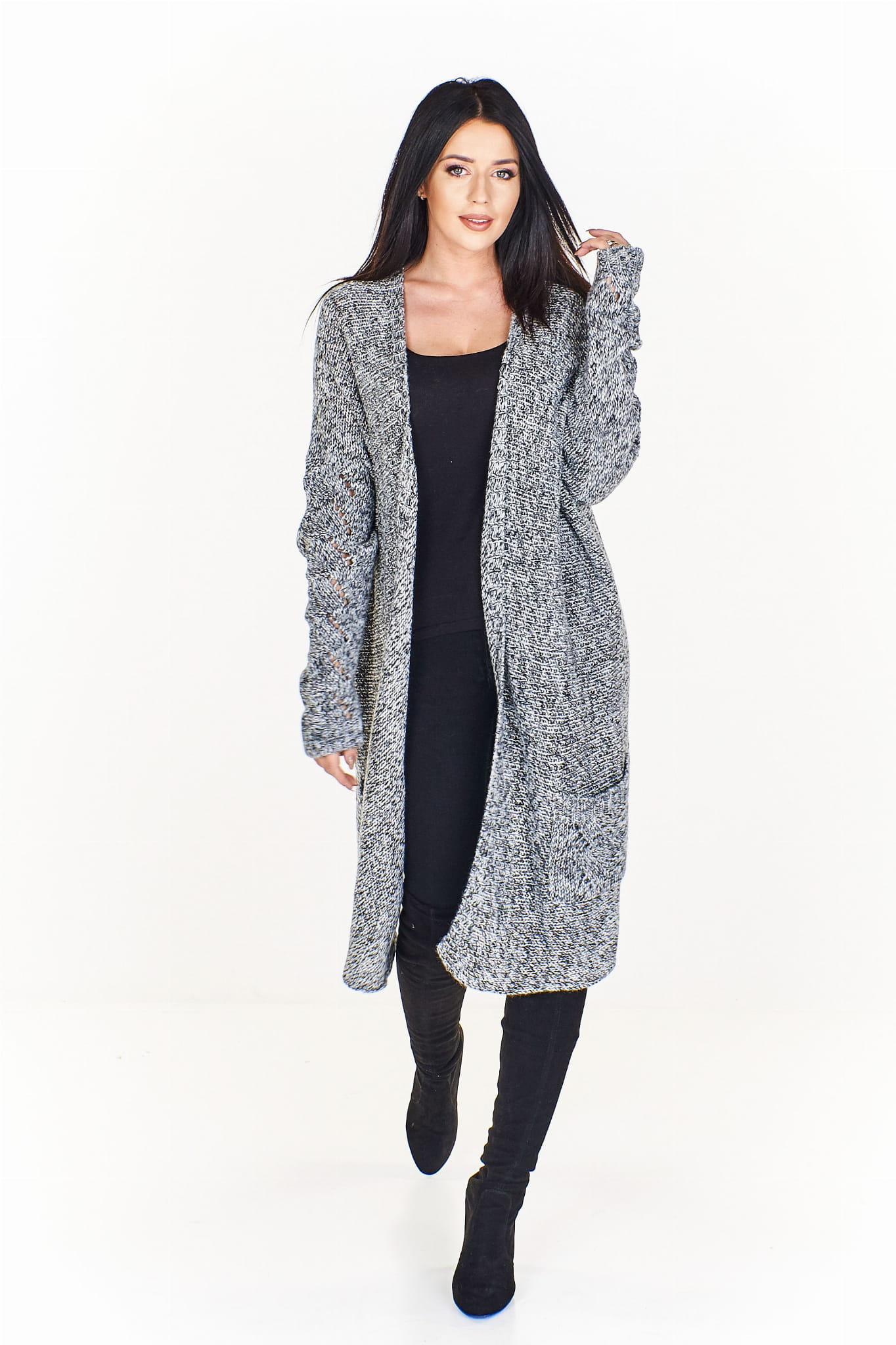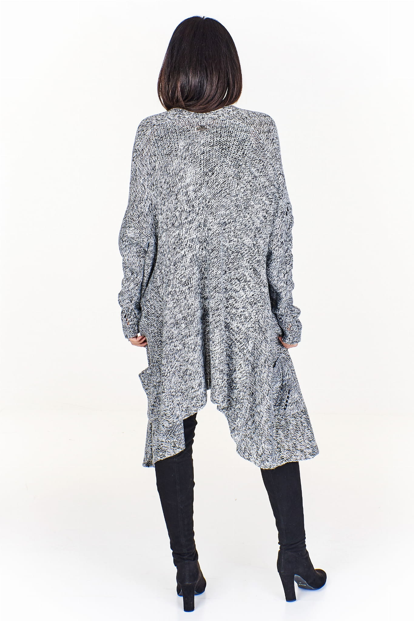 Długi sweter o asymetrycznym kroju z dziurkowanym wzorem na rękawach przeplatany białą nitką