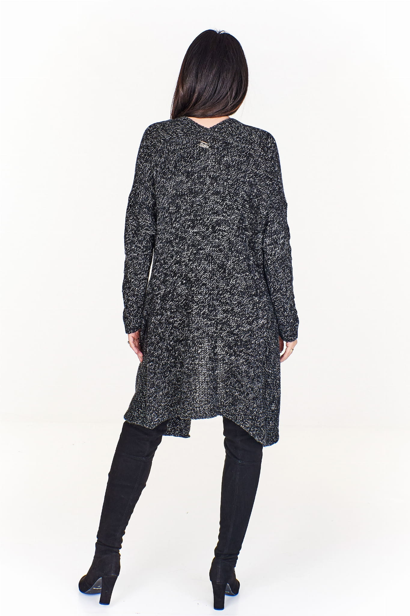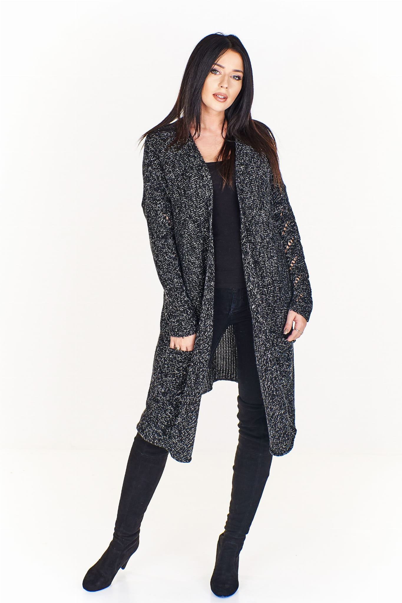 Długi sweter o asymetrycznym kroju z dziurkowanym wzorem na rękawach przeplatany białą nitką