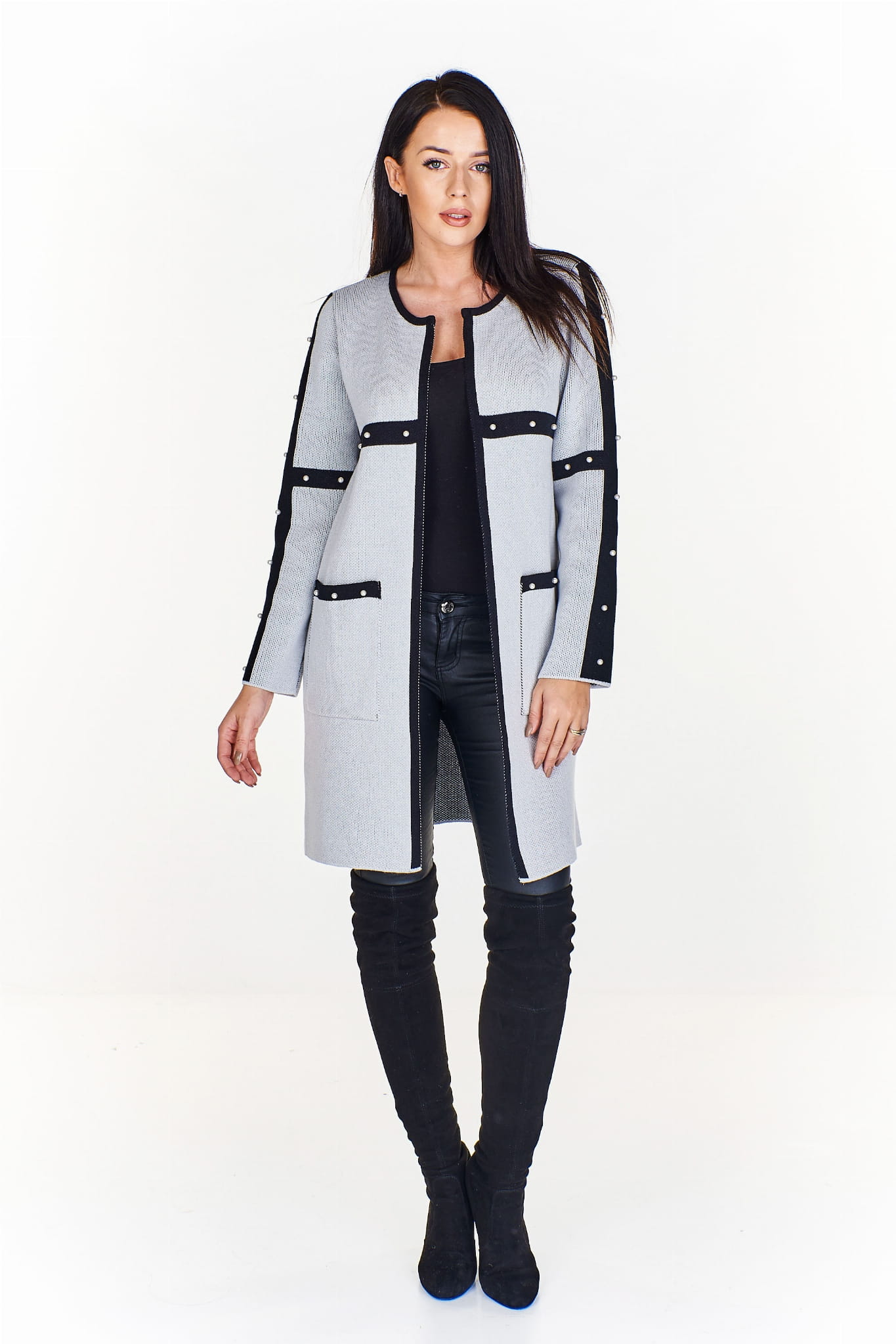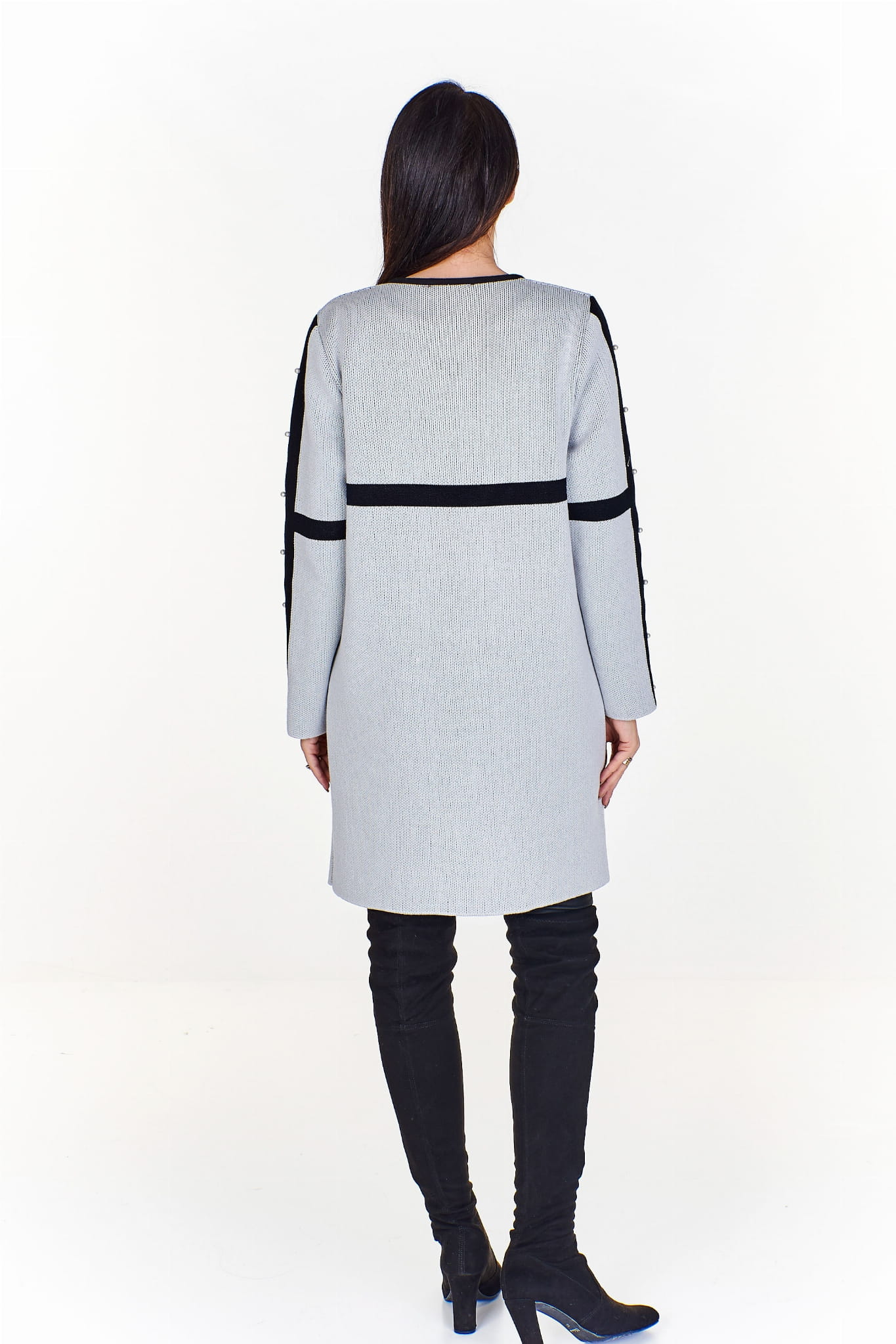 Długi sweter z kontrastującymi wstawkami i ozdobnymi perełkami