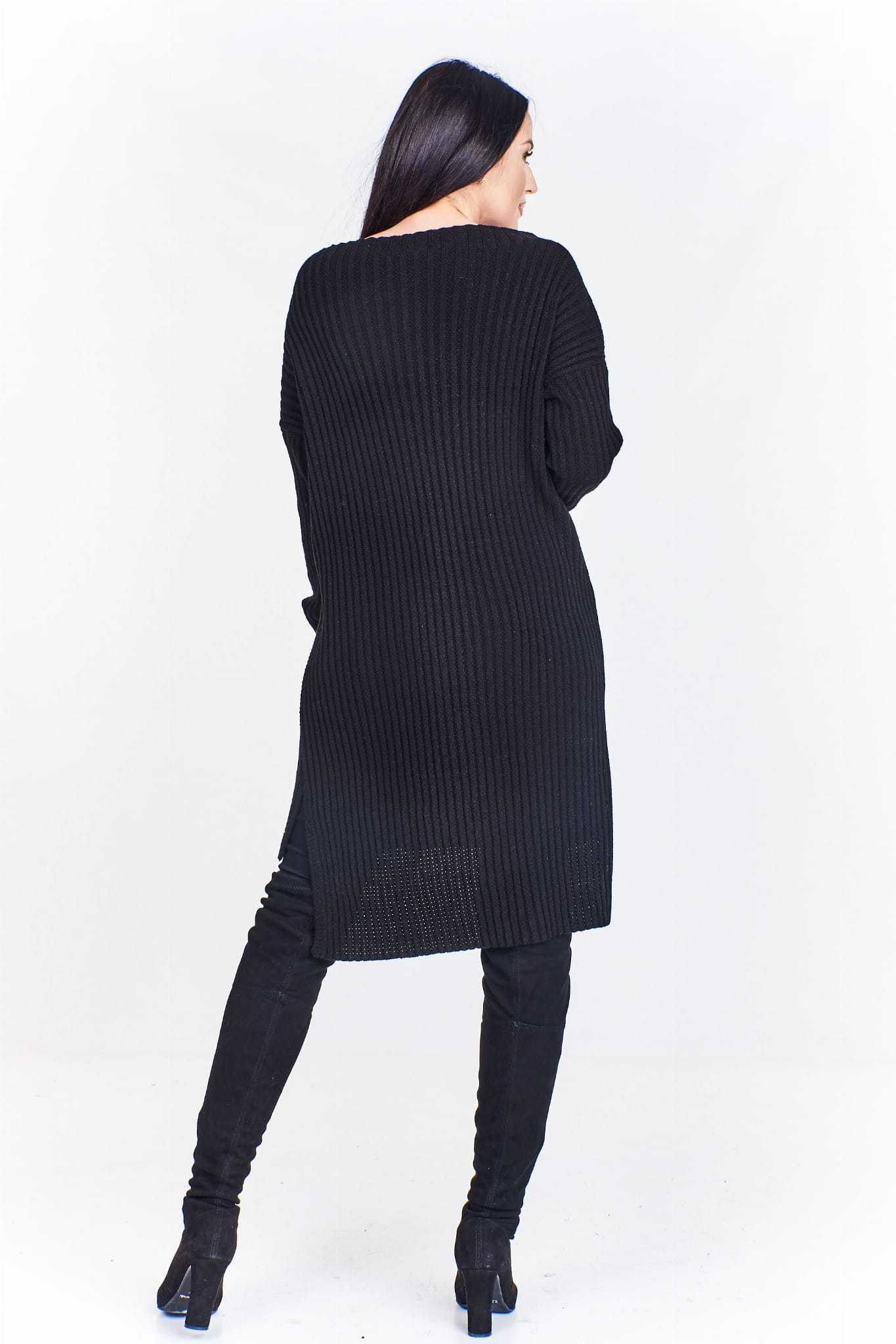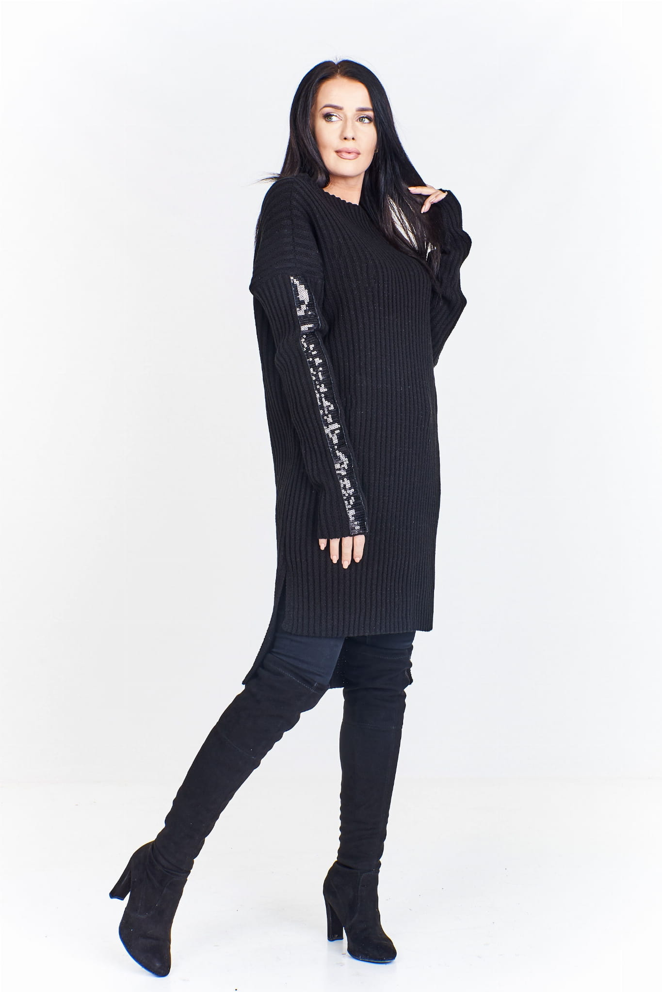 Długi sweter z krótszym przodem ozdobiony cekinowymi lampasami na rękawach (U)